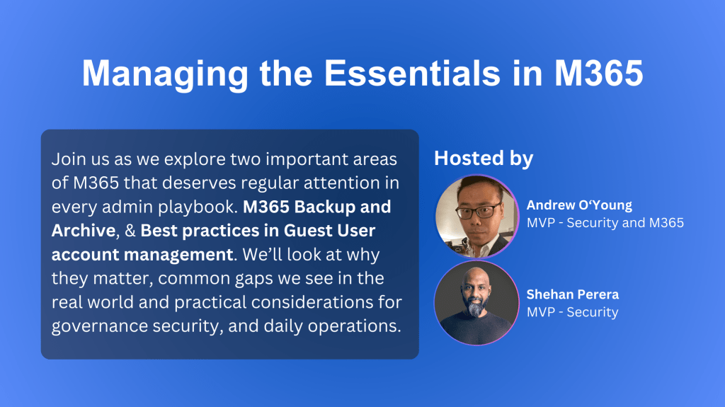 In addition, here is the recording, which includes Andrew and Shehan’s presentation: Managing the Essentials in M365: https://youtu.be/f8tlpALoYeI
